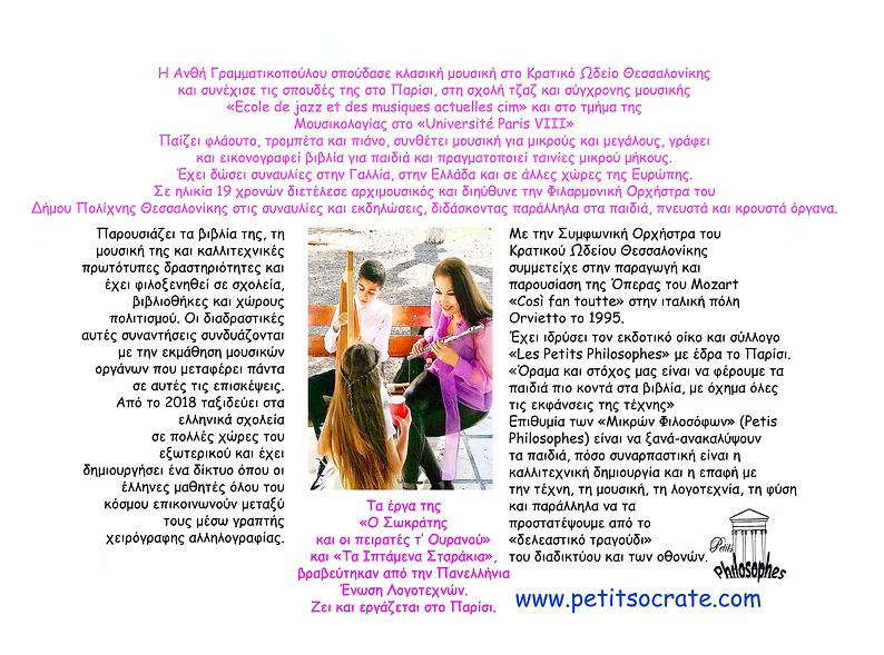 Le deuxième livre de la série, «Socrate et la Porte du Temps», et aussi son conte «Les chaussures volantes», ont été récompensés par l’Union Nationale des Ecrivains Grecs en 2015 et 2016 à Athènes.