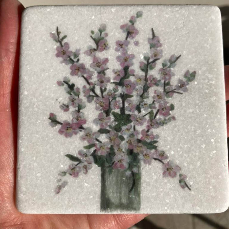 Το ολόλευκο μάρμαρο Θάσου διέσχισε τους αιώνες από την Αρχαιότητα μέχρι σήμερα. Το φωτεινό του χρώμα και οι κρύσταλλοι που λαμπυρίζουν ήταν έμπνευση για να πραγματοποιήσω αυτά τα αντικείμενα τέχνης. Εικόνες από τα βιβλία μου, λουλούδια από τους ζωγραφικούς πίνακες της μητέρας μου και Αρχαία Ελληνική Τέχνη κοσμούν την μαρμάρινη επιφάνεια.