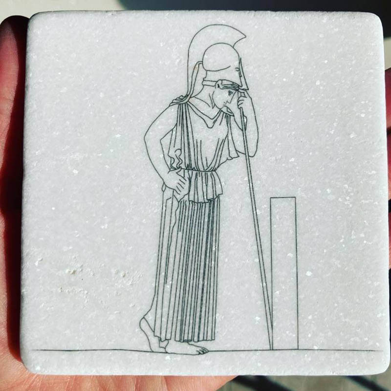 Η θεά φοράει πέπλο και κράνος κορινθιακού τύπου.